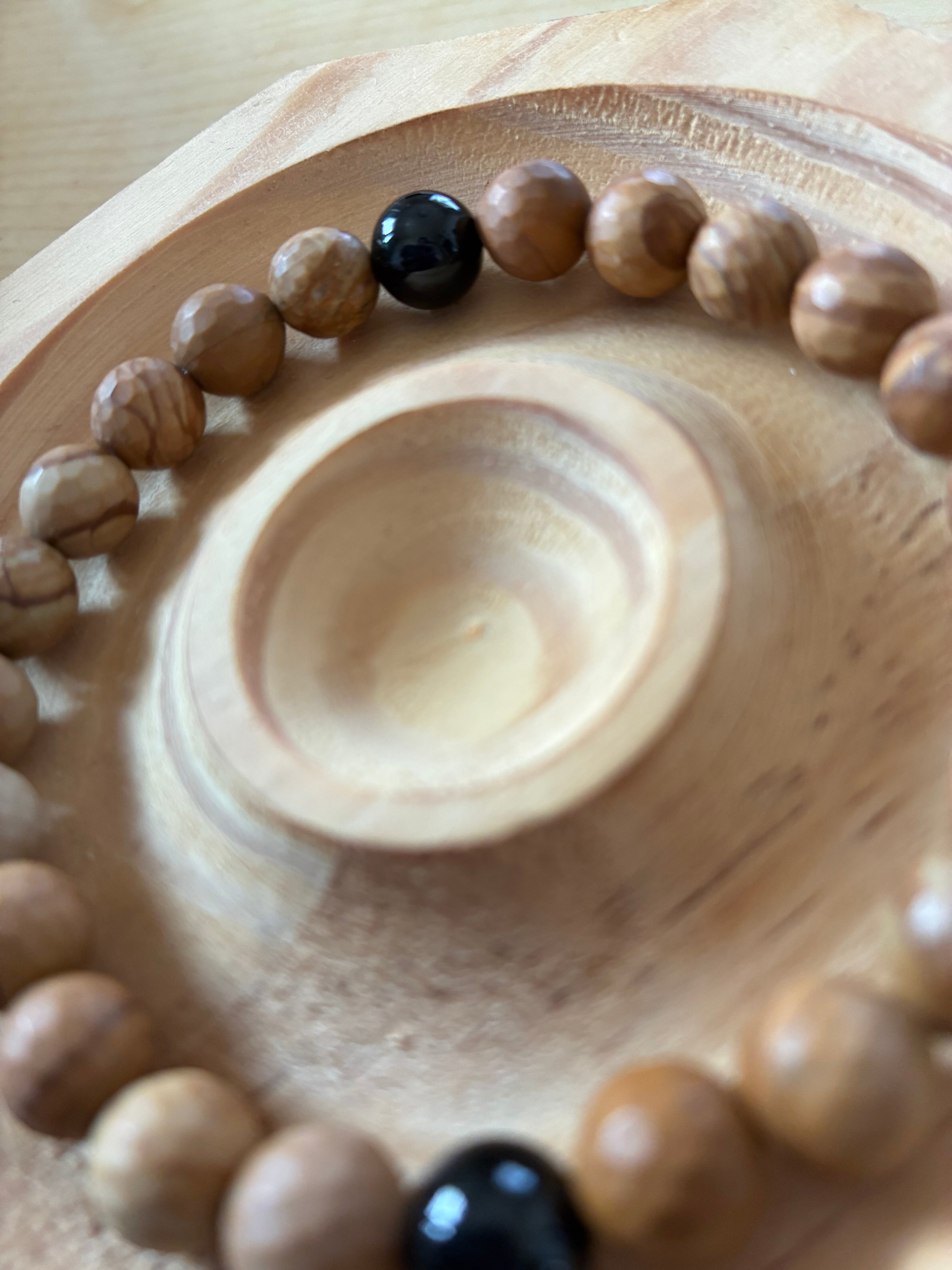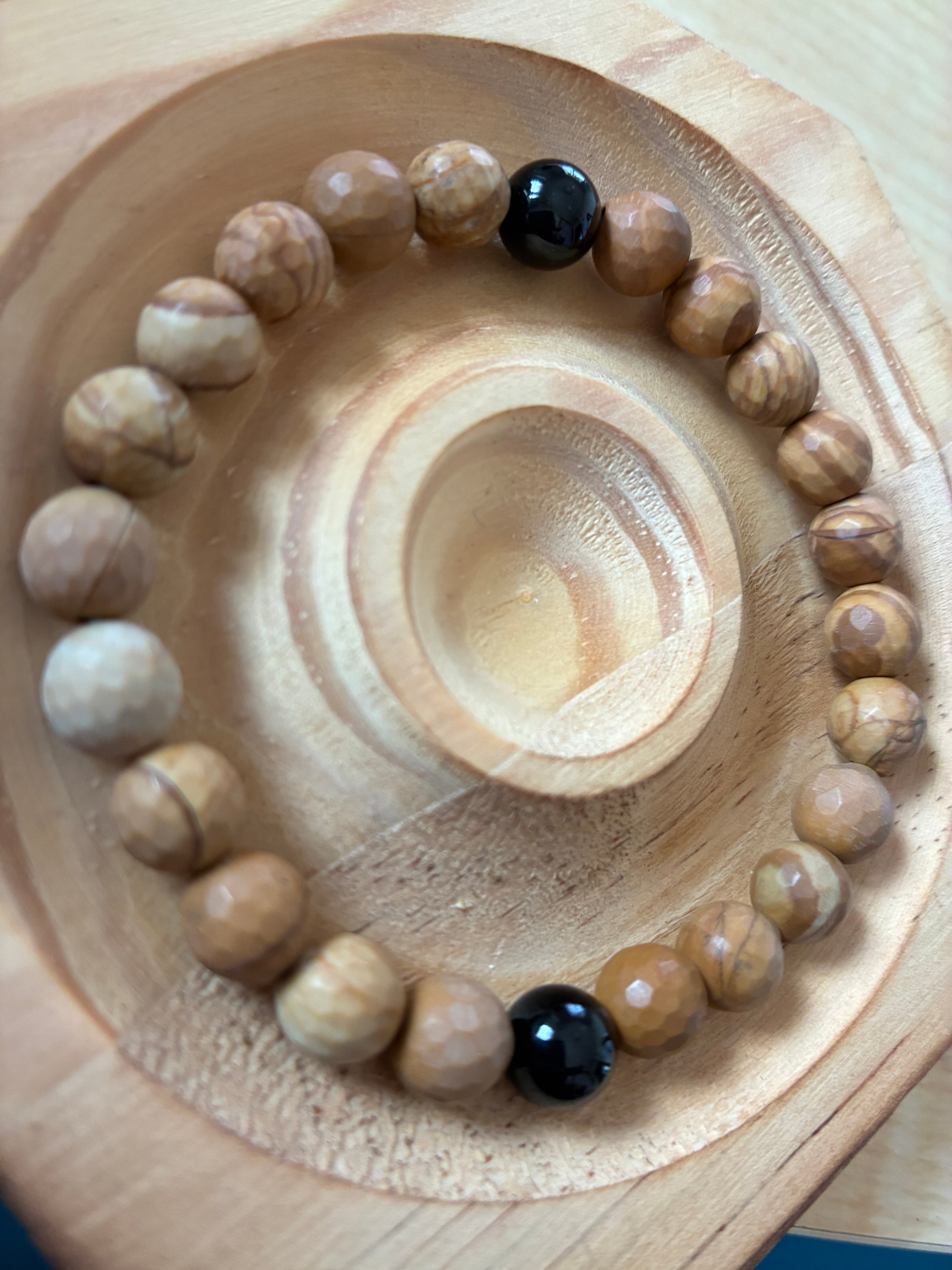 このオニキスは、その深い黒色が手元を引き締め、洗練された印象を与えます。一方、佳化木は自然の美しさを感じさせる独特の模様が特徴で、気品あるスタイルを演出します。8㎜の石が連なり、特別なシーンにもカジュアルな日常使いにもお楽しみいただけるアイテムです。オニキスと佳化木が持つエネルギーは、日常生活に安らぎのひとときをもたらしてくれることでしょう。