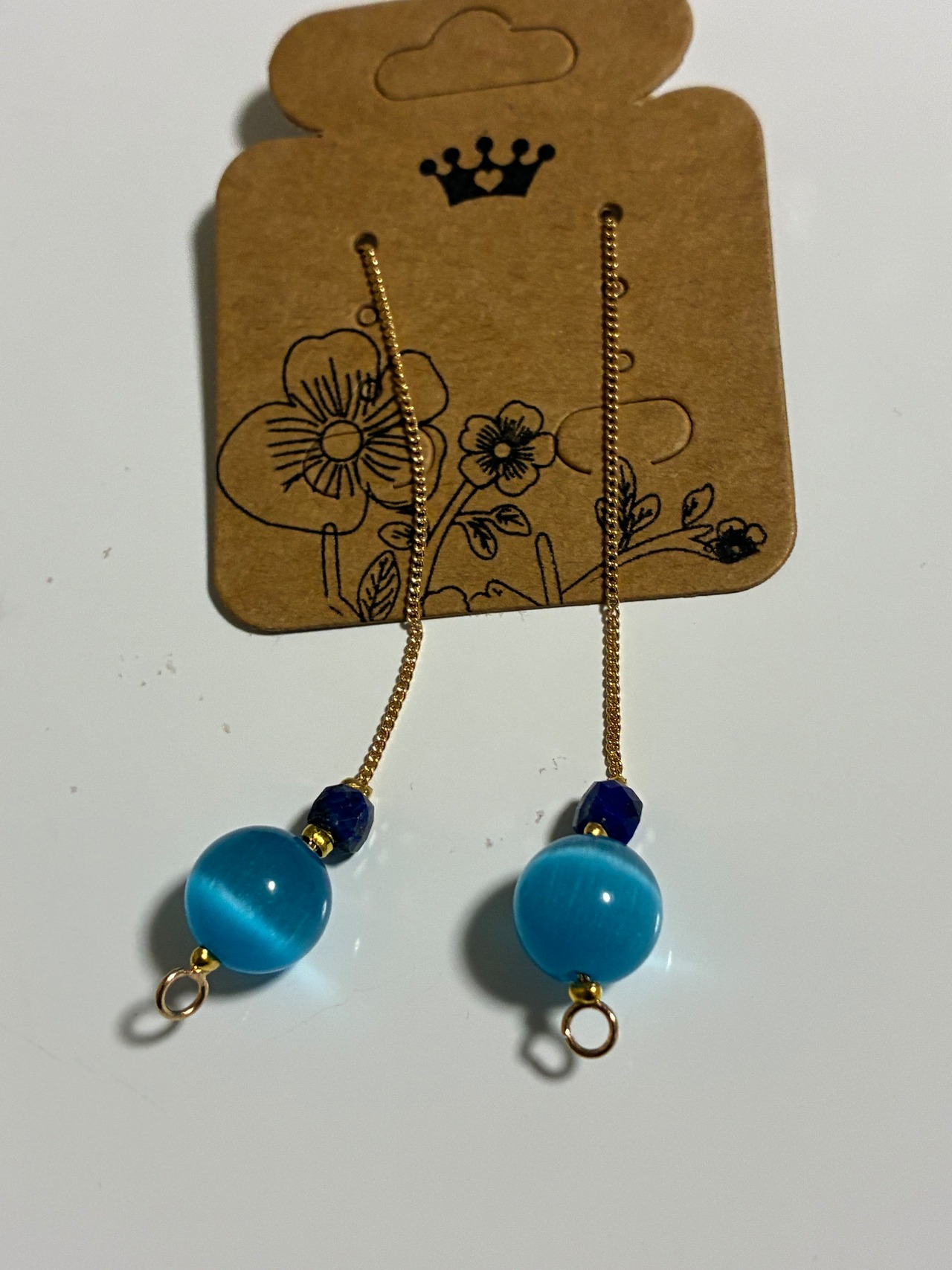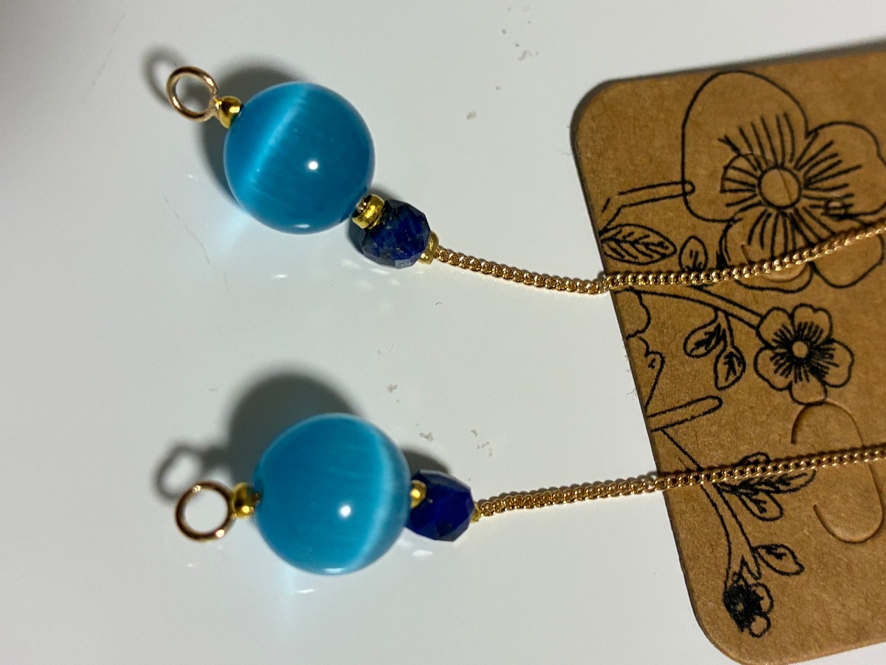 ブルーキャッツアイは、その鮮やかな青色が耳元を華やかに彩り、ラピスラズリの深い青が相まって、エレガントな印象を与えます。軽やかなデザインが、動くたびに優雅に揺れ、あなたの存在感を一層引き立てます。天然素材の組み合わせは、あなたの日常に新たな魅力を添えてくれることでしょう。