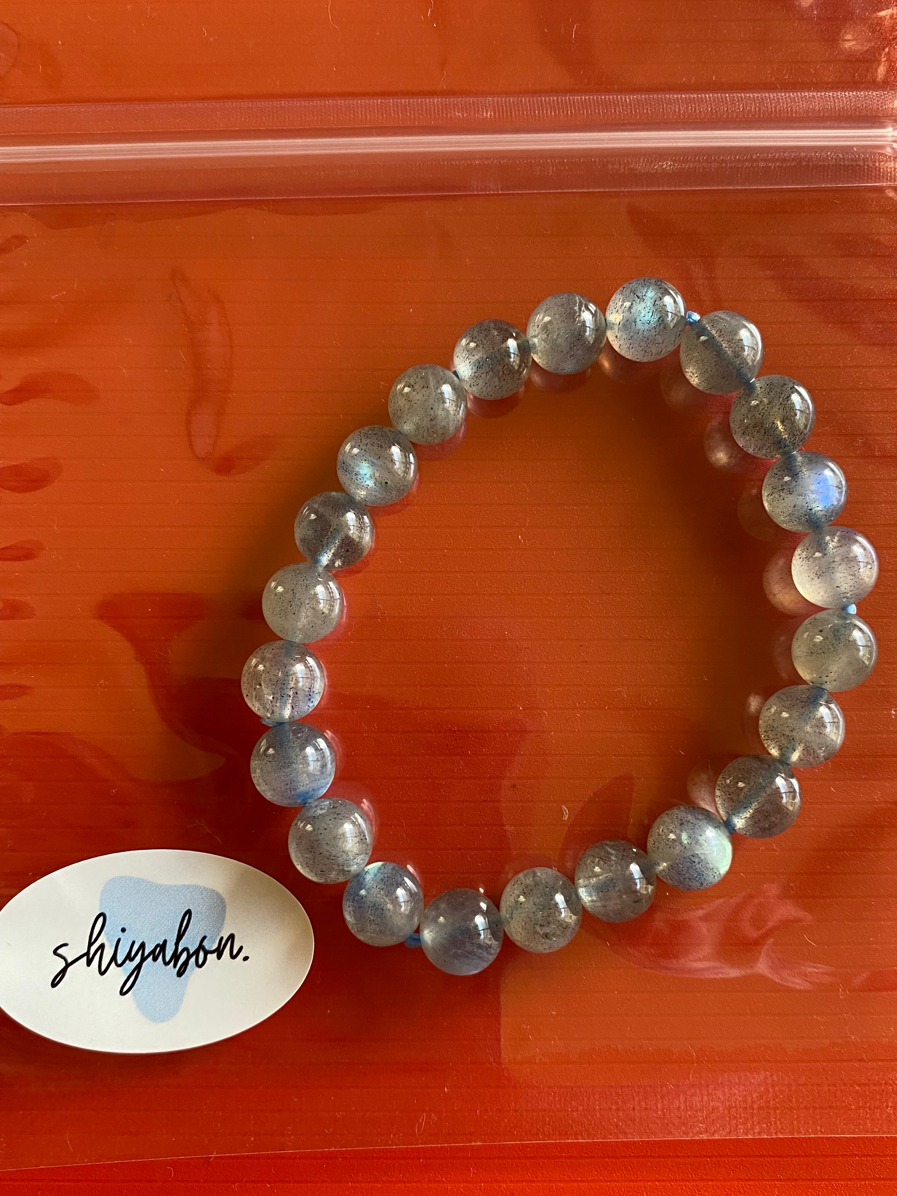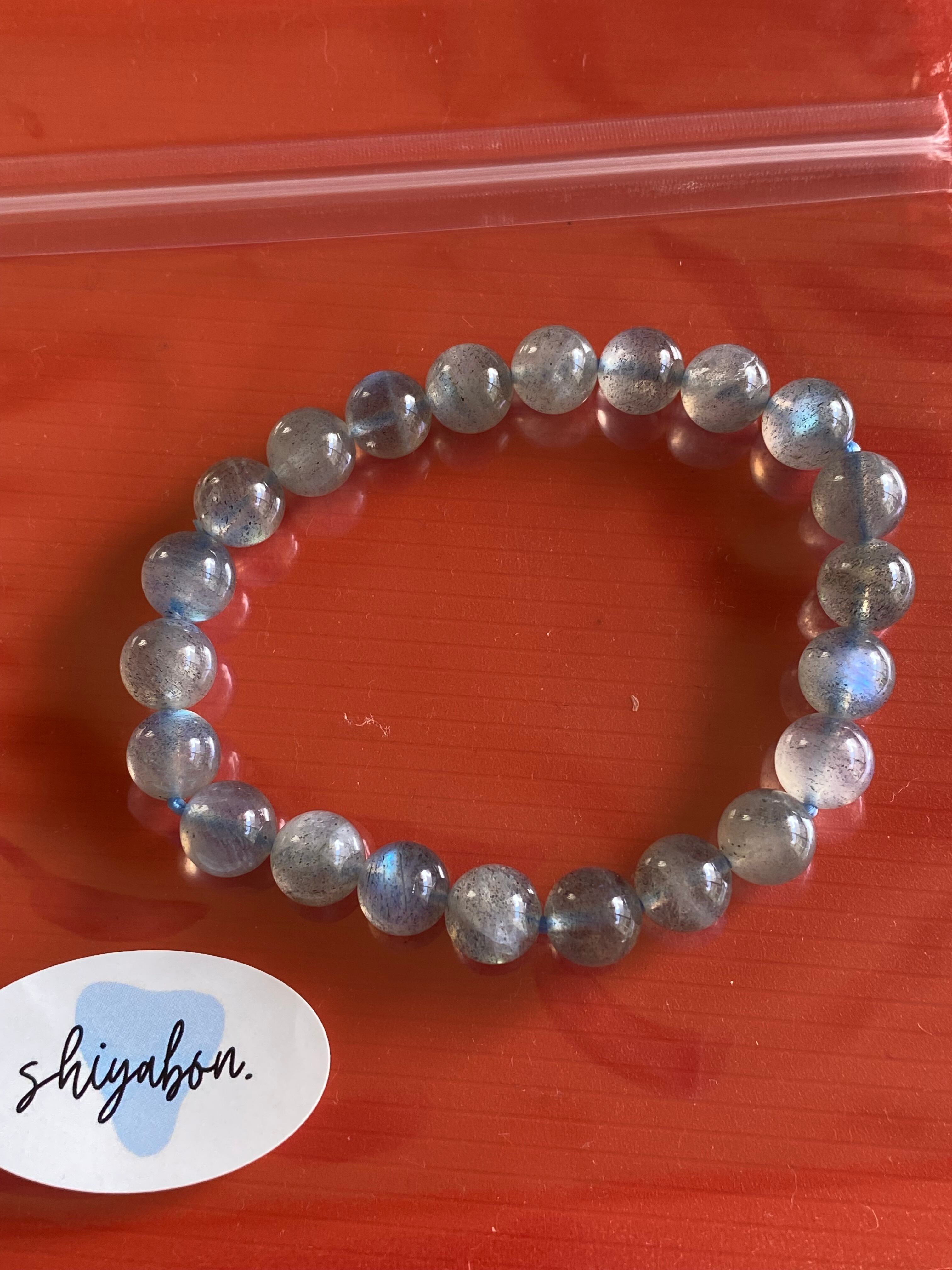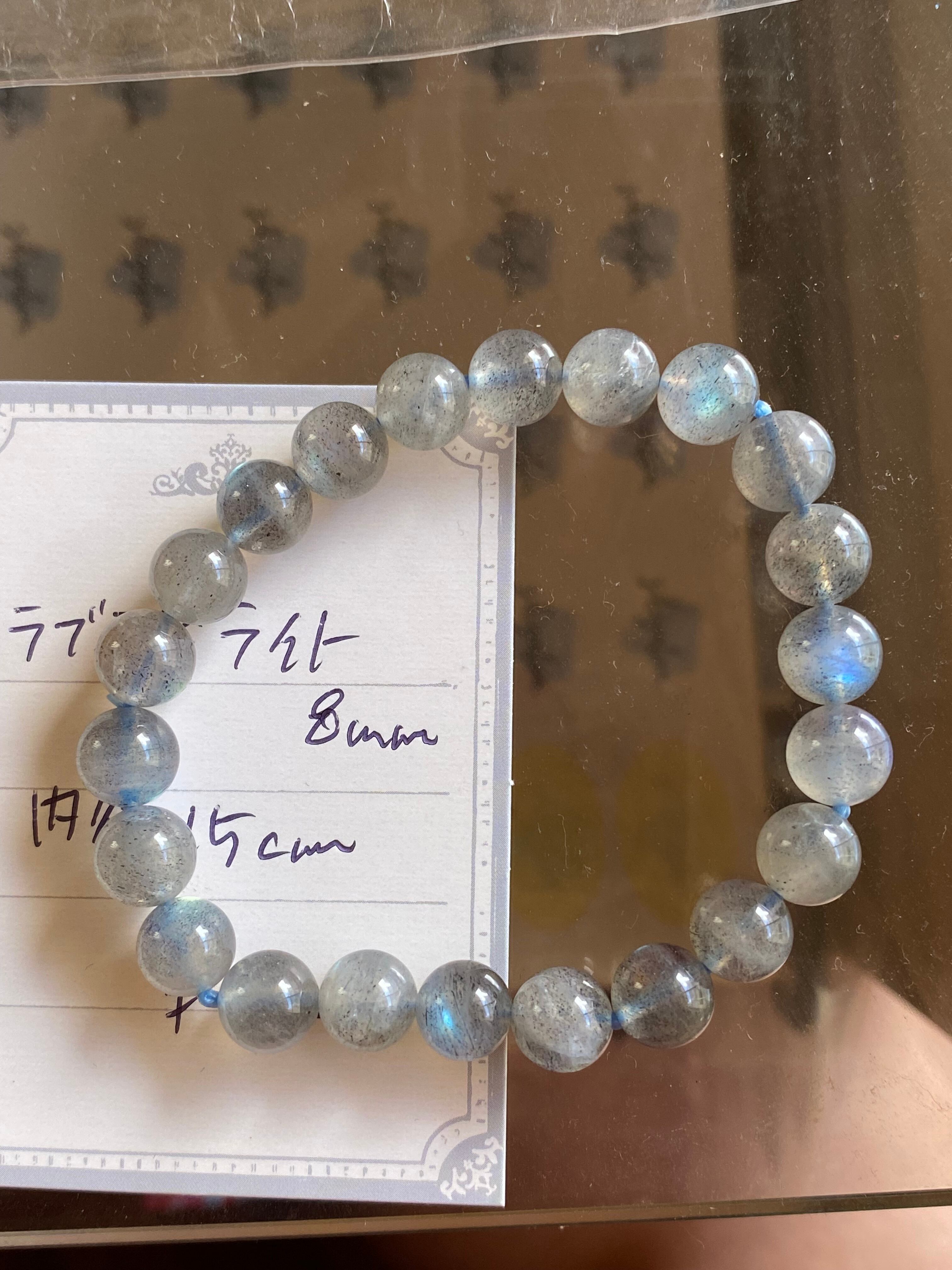 ラブラドライト8㍉ 内径15㌢ ゴムを強めに使っていますが、水仕事などの時は外して行って下さい。 浄化して下さいね。 セージで燻す、クリスタルチュナー