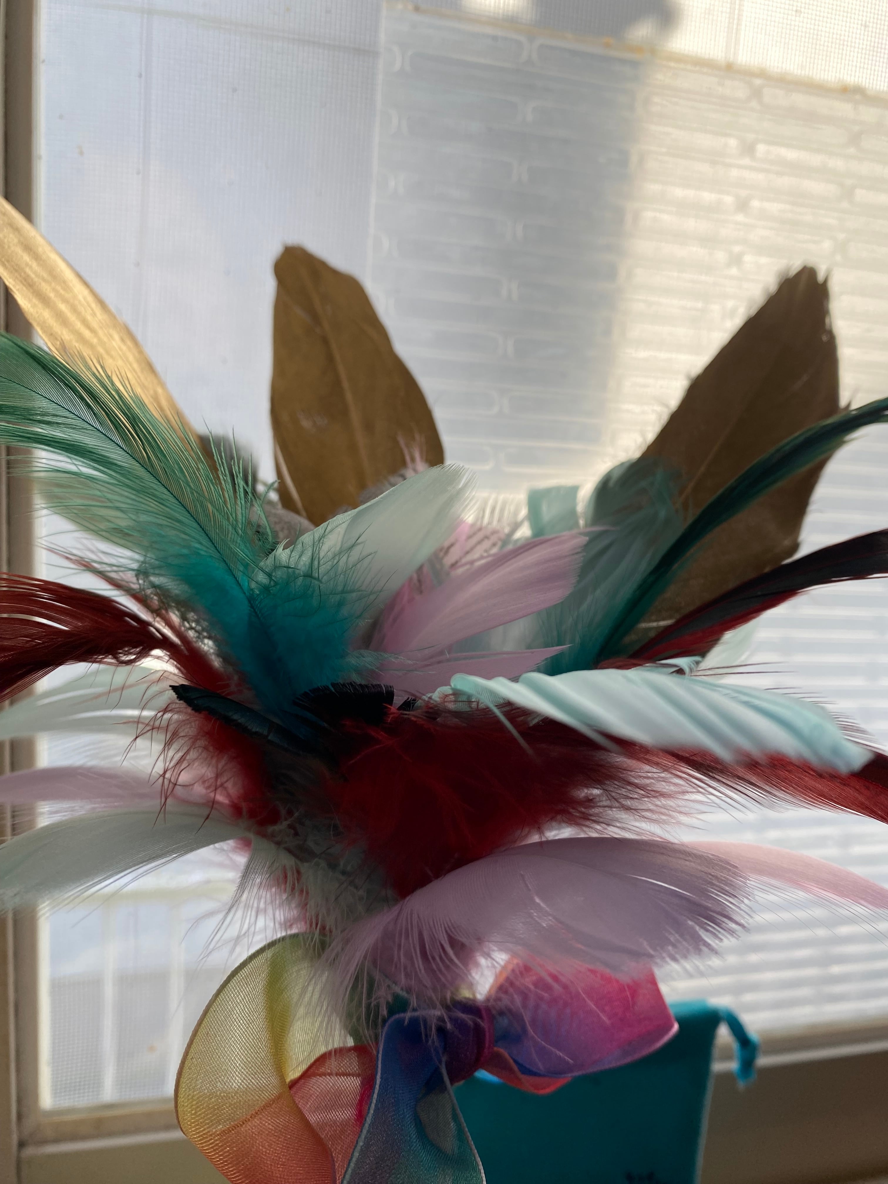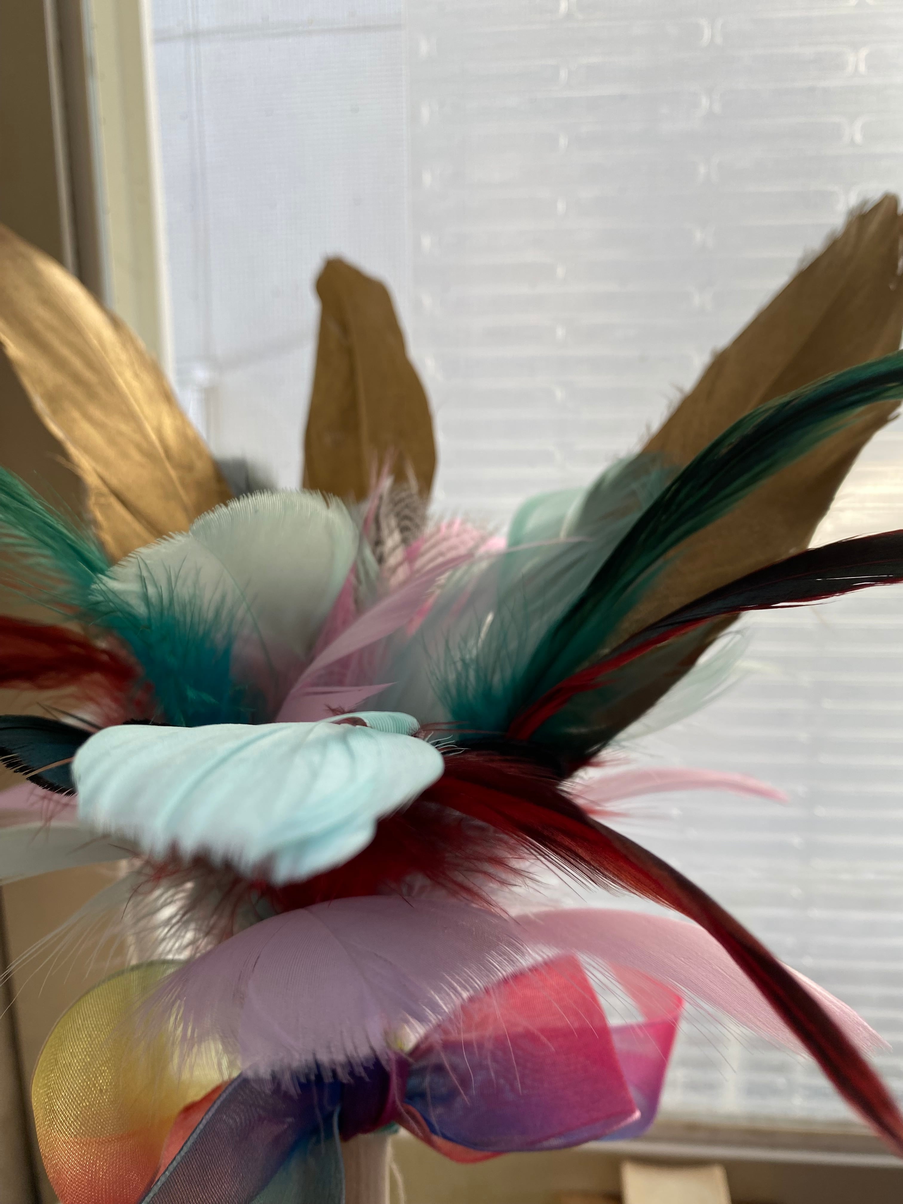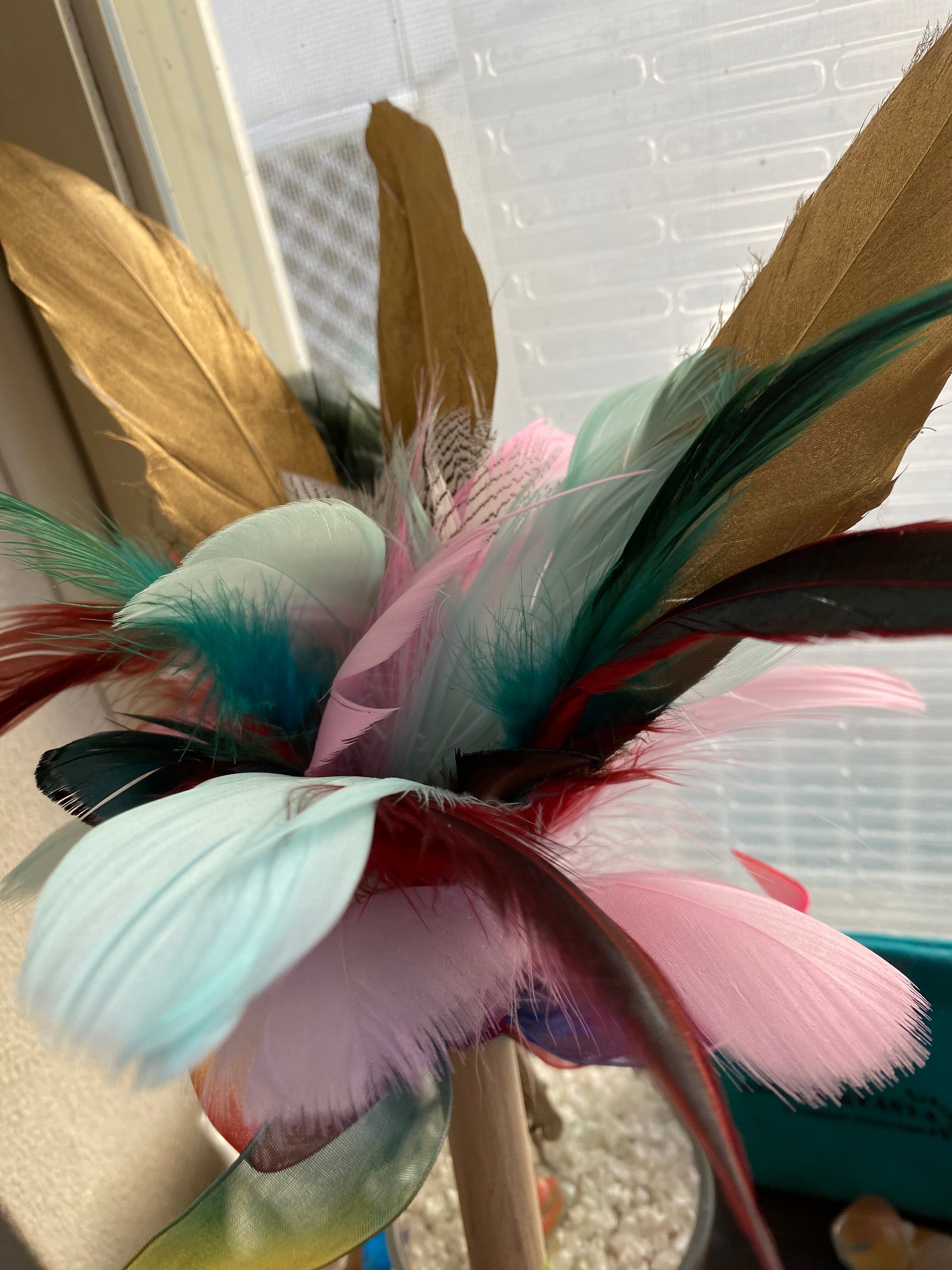**羽根ワンド(ゴールド・薄グリーン)**は、豪華なゴールドと爽やかな薄グリーンの羽根があしらわれた、洗練されたデザインのアイテムです。この羽根は、厳選された自然素材を使用し、一つ一つ丁寧にハンドメイドで制作されています。そのため、特別なシーンに彩りを加えるのにぴったりです!